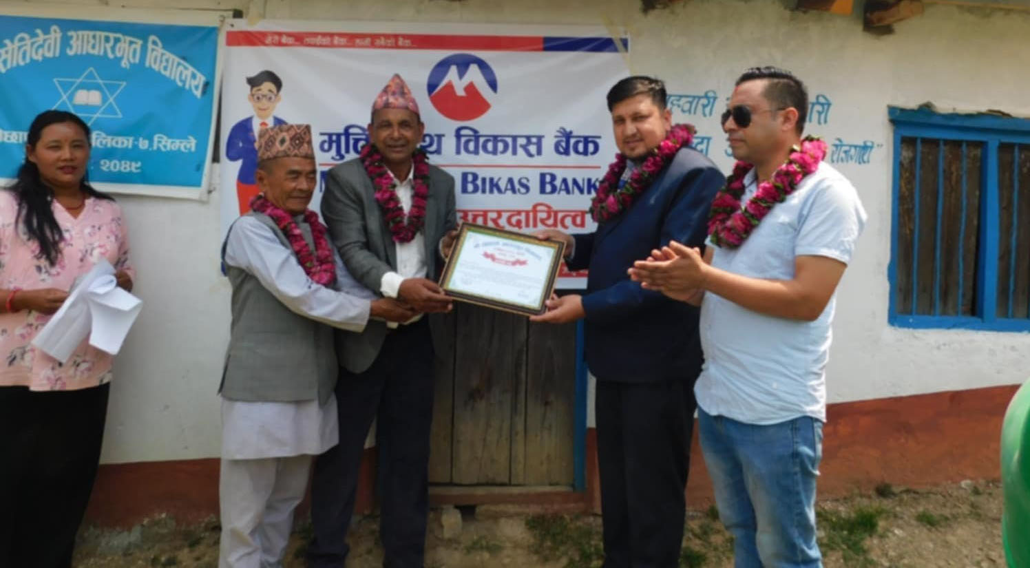 रामेछाप । खानेपानी व्यवस्थापनको लागी सेतीदेवी आधारभूत विद्यालयलाई मुक्तिनाथ विकास बैङ्क शाखा कार्यालय मन्थली शाखाले सहयोग गरेको छ । रामेछाप नगरपालिका वडा नं ७ सिम्लेमा रहेको सेतीदेवी आधारभूत विद्यालयलाई आइतबार मुक्तिनाथ विकास बैङ्क शाखा कार्यालय मन्थलीले २ हजार मिटर पाइप र पानी सङ्कलन गर्न १ हजार लिटरको २ वटा ट्याङ्की विद्यालयलाई हस्तान्तरण गरेको हो ।