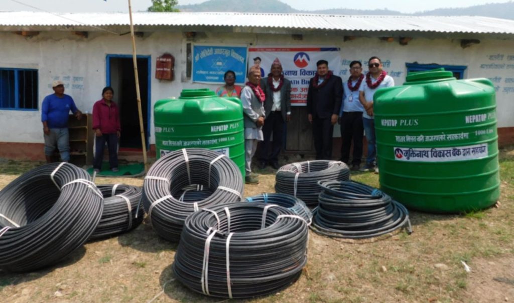 विद्यालयमा खानेपानी सुविधा नहुँदा विद्यार्थी र शिक्षकले समस्या भोग्न परेको गुनासा आए सँगै बैङ्कका टोली विद्यालयमै पुगेर खानेपानी प्रबन्धको लागी आवश्यक सामाग्रीहरू हस्तान्तरण गरेको बैङ्कका शाखा प्रमुख बद्री रिमालले जानकारी दिए । रिमालले विद्यालयमा खानेपानी समस्या रहेको भन्ने खबर प्राप्त भए सँगै सामाजिक उत्तरदायित्व कार्यक्रम अन्तर्गत विद्यालयमा खानेपानीको लागी आवश्यक सहयोग गरेको बताउनु भयो ।