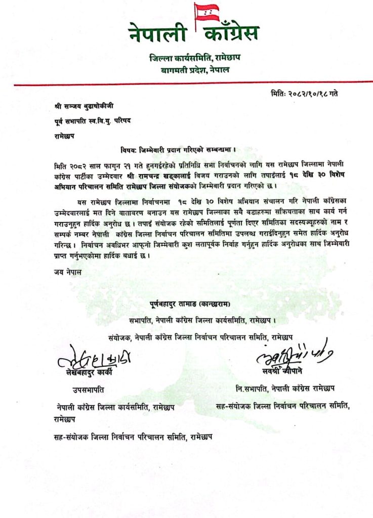 कांग्रेस जिल्ला कार्यसमिति रामेछापका सभापति तथा जिल्ला निर्वाचन परिचालन समितिका संयोजक पूर्णबहादुर तामाङ (कान्छाराम)को नेतृत्वमा जारी पत्रमा निर्वाचन अवधिभर प्राप्त जिम्मेवारीलाई कर्तव्यनिष्ठ रूपमा निर्वाह गर्न आग्रह गरिएको छ। साथै अभियान सफल बनाउन आवश्यक सहयोगका लागि जिल्ला निर्वाचन परिचालन समितिका सदस्यहरू परिचालन गरिने उल्लेख गरिएको छ।