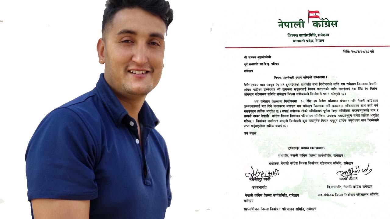 रामेछाप । आगामी प्रतिनिधिसभा निर्वाचनमा नेपाली कांग्रेसका उम्मेदवार रामचन्द्र खड्कालाई विजयी गराउने उद्देश्यसहित रामेछापमा युवा शक्ति परिचालनलाई केन्द्रमा राख्दै विशेष चुनावी अभियान सुरु गरिएको छ। कांग्रेस जिल्ला कार्यसमिति रामेछापले १८ देखि ३० वर्ष उमेर समूहका युवा तथा Gen-Z मतदातालाई लक्षित गर्दै सञ्चालन गरिने विशेष अभियानको संयोजकको जिम्मेवारी विद्यार्थी नेता सञ्जय बुढाथोकीलाई प्रदान गरेको हो।