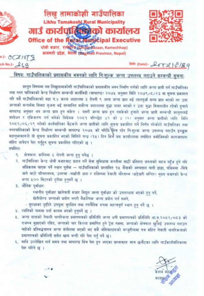 रामेछापको लिखु तामाकोशी गाउँपालिकाको कार्यालय भवन बनाउन ६ रोपनी जग्गा दान गर्न आव्हान गरिएको छ । धोबी बजारमा लामो समयदेखि भाडाको घरबाट सेवा प्रवाह गरिरहेको पालिकाले आफ्नै भवन निर्माण गर्ने योजनाको साथ जग्गा उपलब्ध गराउन पालिकावासीलाई आग्रह गरेको हो । गौरवको आयोजना अन्तर्गत भवन निर्माणका लागि जग्गा प्राप्ति प्रक्रिया सुरु गरिएको पालिकाले जनाएको छ । पालिकाले असोज ३१ गते सूचना जारी गर्दै उपयुक्त जग्गा उपलब्ध गराउन इच्छुक व्यक्ति तथा संघसंस्थाहरूलाई १५ दिनभित्र निवेदन दिन आह्वान गरेको छ। सूचना अनुसार पहिल्यै वडा नं. ४ काला आहालमा जग्गासँगै लालपुर्जा समेत प्राप्त भएपनि विवाद भएपछि मुद्दा परेको थियो । त्यहाँ भवन बनाउन सम्भव नभएपछि पुन: जग्गा प्राप्तिको लागि आवेदन पेश गर्न पालिकावासीलाई आव्हान गरिएको सूचनामा उल्लेख छ । सूचनाामा पालिकाको मापदण्ड र निर्देशिका बमोजिम उपयुक्त जग्गा उपलब्ध गराउन भनिएको छ । जग्गा प्राप्ति भएपछि भवन निर्माण प्रकिया अघि बढ्ने पालिकाका अध्यक्ष केशव महतले बताउनु भयो । भवन निर्माणको लागि चालु आर्थिक बर्ष ३ करोड रुपैयाँ बिनियोजन गरिएको उहाँले जानकारी दिनु भयो । अघिल्लो कार्यकालमा बन्न नसेको पालिकाको भवन आफ्नो कार्यकालमा बनाइछाड्ने उहाँको प्रतिबद्दता छ । पालिकाको भवन निर्माण भएपछि सेवा प्रवाहलाई थप प्रभावकारी र व्यवस्थित बनाउ सकिनेछ, भने भाडाबापतको लाखौँ खर्च जोगिने छ । जग्गा प्राप्तिको लागि निम्न विषेशता हुनु पर्ने सूचनामा उल्लेख छ ।