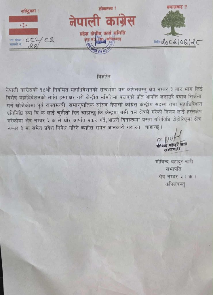 कपिलवस्तु । नेपाली कांग्रेस कपिलवस्तु क्षेत्र नं. ३ (क) क्षेत्रीय समितिले पूर्वराज्यमन्त्री तथा पूर्वसांसदलाई प्रवेश निषेधको चेतावनी दिएको छ। क्षेत्रीय समितिका सभापति गोविन्दबहादुर खत्रीद्वारा मंगलबार जारी विज्ञप्तिमा नेपाली कांग्रेसको १५औँ महाधिवेशनको सन्दर्भमा उक्त क्षेत्रबाट विशेष महाधिवेशनका लागि हस्ताक्षर संकलन गरी केन्द्रीय समितिमा पठाउने कार्यलाई आपत्ति जनाएको भन्दै त्यसको बिरोध गरेको छ ।