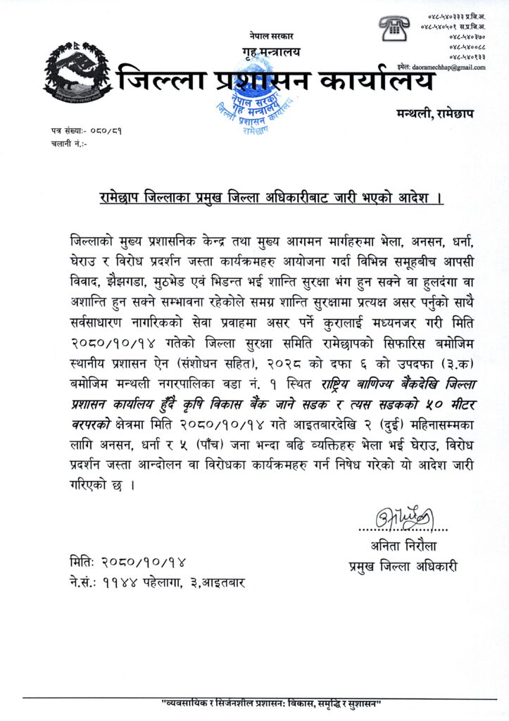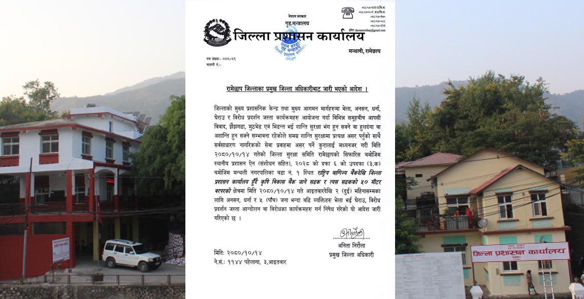 जिल्ला प्रशासन कार्यालयले २०८० माघ १४ गते आइतबार देखि लागु हुने गरी २ (दुई) महिनाका लागि पाँच जना भन्दा बढी व्यक्ति भेला जम्मा भई जुलुस, प्रदर्शन, धर्ना, घेराउ, अनसन, सभा जस्ता आन्दोलन वा विरोधका कार्यक्रम गर्न निषेध गरेको आदेश जारी गरिएको छ । रामेछापका प्रमुख जिल्ला अधिकारी अनिता निरौलाद्वारा आइतबार जारी आदेशमा उल्लेख छ ।